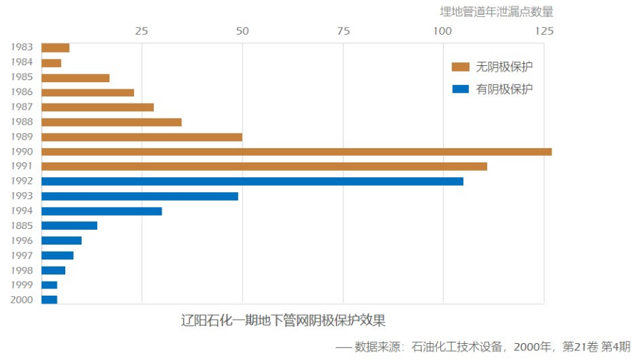 实施阴极保护是防止大型石化企业防爆装置区埋地管道腐蚀泄漏最经济有效的方法。中国石油辽阳石化分公司一期生产装置区原本准备报废重建的埋地管网,从1992年开始陆续追加阴极保护之后,又安全服役了将近30年,取得了巨大的经济效益。