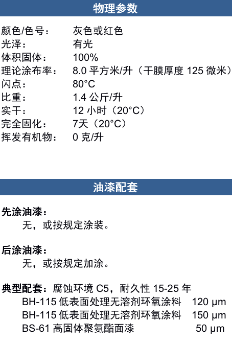 BH-115是一种双组分无溶剂低表面处理聚胺固化环氧涂料。具有优异的防腐性和耐水性。兼容各种老化旧涂层,例如醇酸、环氧和聚氨酯。在密闭空间施工,可降低爆炸和火灾风险。容易施工。
