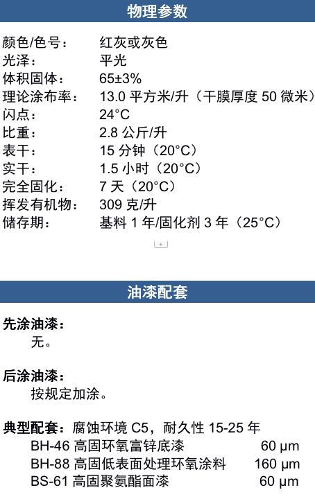 BH-46是一种双组分环氧富锌底漆。固化后形成坚硬耐磨和高耐候涂层,具有优异的防腐性。