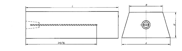 梯形镁阳极的横截面为梯形,这种形状的阳极铸造起来最为方便和经济。梯形镁合金阳极是土壤中和海水中常用的规格类型,它兼顾了较大的表面发散电流的能力和通过设计获得较长使用寿命的表面积/重量比率的条件。梯形镁阳极的具体形状有2种,我们称为形状甲和形状乙,形状甲的钢芯未伸出阳极形状之外,形状乙的钢芯伸出了阳极形状之外。